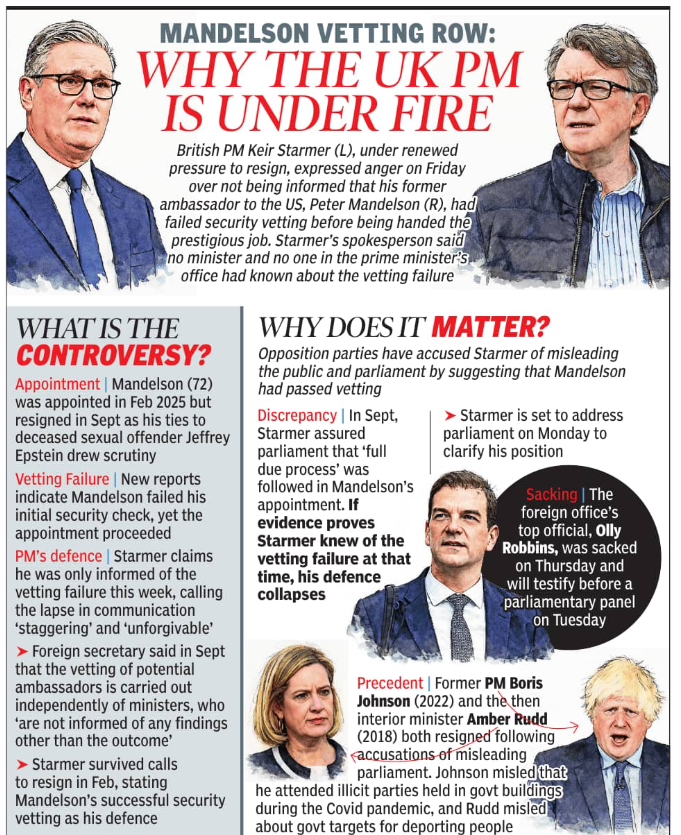 British Prime Minister Keir Starmer said Friday he was “furious” that he was not told former Labour minister Peter Mandelson had failed his security vetting before becoming the UK’s ambassador to the United States, as opposition leaders called for his resignation.It has since emerged that two of Starmer’s top aides knew about the vetting failure weeks before the prime minister was informed.